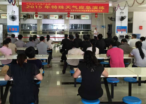 因北海天氣多變,特殊天氣隨時可能發(fā)生,為防止隨時可能出現(xiàn)的特殊天氣對園區(qū)安全帶來不利影響,確保園區(qū)設備財產(chǎn)的正常運轉、安全,確保園區(qū)安全生產(chǎn)零事故,同時為讓員工熟悉應對特殊天氣的工作流程,做到工作有計劃性、準備工作及時到位、突發(fā)事件處理及時,園區(qū)物業(yè)公司(中電瑞達)于2015年6月9日下午,組織公司全體人員開展了一次特殊天氣應急演練。整個演練分為:特殊天氣應急預案培訓、特殊天氣應急演練兩大部分。為確保此次演練順利進行,物業(yè)公司積極準備,專門組織各部門負責人召開專題會議,完善方案、物資準備,部署每個演練環(huán)節(jié),明確人員分工、時間節(jié)點、演練流程。