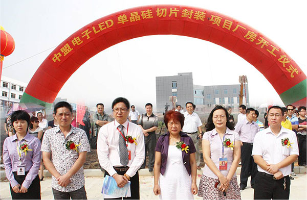 2011年10月28日上午,廣西北海中盟電子科技開發(fā)公司3號廠房舉行了隆重的開工儀式,該廠房建筑面積11000平方米,預(yù)計2012年7月底投入使用,主要從事LED封裝、單晶硅切片封裝、太陽能路板生產(chǎn)。