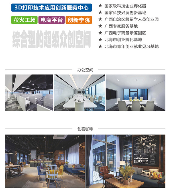 中電北海產業(yè)園眾創(chuàng)空間規(guī)劃面積5000平方米,重點圍繞智慧城市、智能硬件、物聯(lián)網、移動互聯(lián)網、大數據、電子商務等重點新型產業(yè)領域,采取互聯(lián)網+現場服務的模式,整合上下游資源,為入住企業(yè)和創(chuàng)業(yè)者提供政策咨詢、科研支持、人才引進、電商培訓、創(chuàng)業(yè)指導、融資對接等服務,形成支持創(chuàng)新創(chuàng)業(yè)的生態(tài)圈。中電北海產業(yè)園眾創(chuàng)空間通過整合各方資源,已經集成一批面向區(qū)域主導產業(yè)的前沿技術,整合了戰(zhàn)略投資基金、天使基金和社會投資相結合的創(chuàng)新創(chuàng)業(yè)投資基金,建立了涵蓋科學家、創(chuàng)業(yè)企業(yè)家和企業(yè)運營管理專家的創(chuàng)業(yè)導師團隊,聚集電商平臺、3D打印技術應用創(chuàng)新服務中心、創(chuàng)新學院、螢火工場實驗室等一體化服務機構構成綜合型的超級眾創(chuàng)空間。