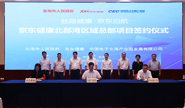2019年9月23日,京東健康北部灣區(qū)域總部項(xiàng)目簽約儀式在北海香格里拉大酒店舉行。市長(zhǎng)蔡錦軍,京東集團(tuán)副總裁、京東健康首席執(zhí)行官辛利軍,中電北海產(chǎn)業(yè)園發(fā)展有限公司執(zhí)行董事徐俊男等見證簽約儀式。