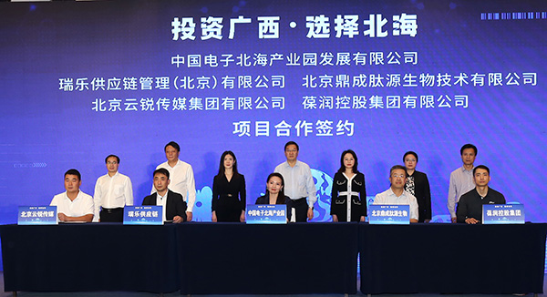 在北海市委書記蔡錦軍,市委常委、常務(wù)副市長譚秀洪,市委常委、秘書長鄭定雄,經(jīng)開區(qū)管委會主任劉忠廣,中國電子北海產(chǎn)業(yè)園公司執(zhí)行董事徐俊男,長江商學(xué)院老師徐汀、長江商學(xué)院老師許耀公的見證下,中國電子北海產(chǎn)業(yè)園發(fā)展有限公司與北京云銳傳媒集團(tuán)有限公司、北京鼎成肽源生物技術(shù)有限公司、瑞樂供應(yīng)鏈管理(北京)有限公司、葆潤控股集團(tuán)有限公司簽署合作協(xié)議。