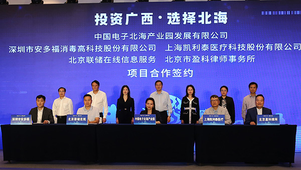 在北海市委書記蔡錦軍,市委常委、常務(wù)副市長譚秀洪,市委常委、秘書長鄭定雄,經(jīng)開區(qū)管委會主任劉忠廣,中國電子北海產(chǎn)業(yè)園公司執(zhí)行董事徐俊男,長江商學(xué)院老師徐汀、長江商學(xué)院老師許耀公的見證下,中國電子北海產(chǎn)業(yè)園發(fā)展有限公司與上海凱利泰醫(yī)療科技股份有限公司、北京聯(lián)儲在線信息服務(wù)有限公司、深圳市安多福消毒高科技股份有限公司、北京市盈科律師事務(wù)所簽署合作協(xié)議。